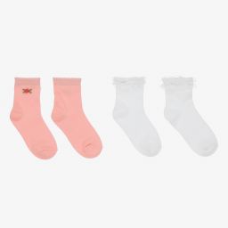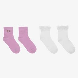 Pack of two pairs of socks for teen girls by Mayoral, knitted in soft and stretchy cotton. The sunny yellow pair have a 3D embroidered flower in yellow and green, while the white pair have a lace ruffle trim around the ankle.