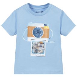 Younger boys white T-shirt by Mayoral, made in soft cotton jersey with popper fasteners on one shoulder. It has a fun camera print in brown and blue with a lenticular picture that changes when moved.