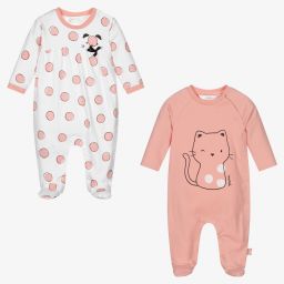 Pack of two white and gold babygrows for girls by Mayoral Newborn, made with soft and stretchy cotton jersey. One babygrow has grey stripes and a gold glitter pineapple character appliqué. The other babygrow has an all-over gold pineapple print with poppers down one side and between the legs.