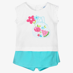 Little girls white top and pink shorts set by Mayoral, made in soft and comfortable cotton jersey. The top has ruched cap sleeves and a colourful glittery flower, frog and cute apple print with green leaf appliqués on the front. The pink shorts have a front flap panel and an elasticated waistband.
