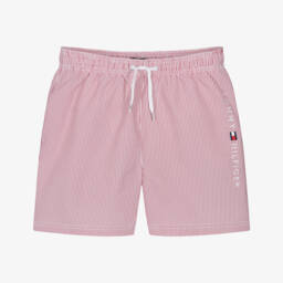 Cool pale blue and white striped swim shorts for teen boys by Italian swimwear brand MC2 Saint Barth, with a fun print of red crabs. Made with beautifully soft, peached and recycled fabric, they have useful, concealed pockets on the side seams and an extra flap pocket on the back, secured with velcro. The waistband has a grey drawstring for a good fit and a logo badge around the back. They have a soft mesh lining for comfort and come with a handy ID strap.