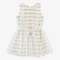 Girls gold knit pleated dress by Michael Kors Kids is a striking addition to any wardrobe. Crafted from a soft blend of viscose and cotton, it features a shimmering gold hue perfect for special occasions. The dress showcases short sleeves and a pleated skirt, complemented by gold-tone branded buttons on the shoulder. The stretchy ribbed neckline ensures easy dressing. With limited quantities available, this elegant piece is a last chance to buy for the discerning shopper.