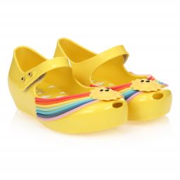 Girls lilac pink peep toe jelly shoes by Mini Melissa, made in a sweet-scented, soft and durable PVC. They are decorated with a colourful rainbow and white cloud across the toes and have a velcro fastening foot strap. The padded soles are flexible with a hidden wedge on the heels and the shoes have non-slip rubber outer soles.