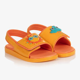 Yellow jelly sandals for girls by Mini Melissa, made in sweet-scented, soft and durable Melflex® PVC. They have a velcro closing foot strap with sun and rain cloud character motifs. They have a softly padded insole, with a non-slip outer sole.
