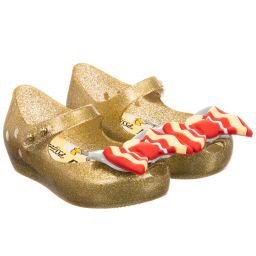 Girls silver glitter jelly shoes by Mini Melissa, with a pink bow from Disney's Dumbo on the front. They are made in sweet scented, soft and durable PVC. The outer soles are flexible and the inner soles are softly padded. There is a hidden wedge heel and signature peep toes, with a velcro strap to fasten.