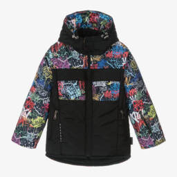 A brown ski jacket for boys and girls by Mini Rodini, with the Swedish brand's panda mascot appliquéd on the chest. Made in waterproof, windproof and breathable technical fabric, it is padded for warmth and has an orange polar fleece lining for cosy comfort. It has a detachable, popper fastening hood with a button-on, super soft faux fur trim. This slope-ready jacket features taped seams, a zip-up ski pass pocket on one sleeve, stretchy internal cuffs with a thumbhole and two zipped front pockets for small items. The contrasting ivory front zip has a fleecy chin guard to prevent rubbing and a light reflective logo is printed on the back for added visibility in severe weather.