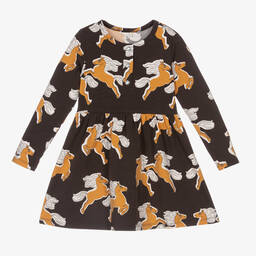 Pink dress for girls by Mini Rodini, made in super soft organic cotton jersey. With jewelled popper fastenings on the front, it has a full, gathered skirt and a cute blue horse print all-over.