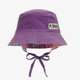 Green bucket hat for boys and girls by Mini Rodini, made in soft organic cotton corduroy. The red and blue check lining is made in organic cotton twill with useful ear flaps and ties that fasten under the chin. It has a logo badge embroidered on the front.