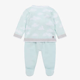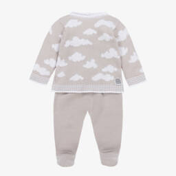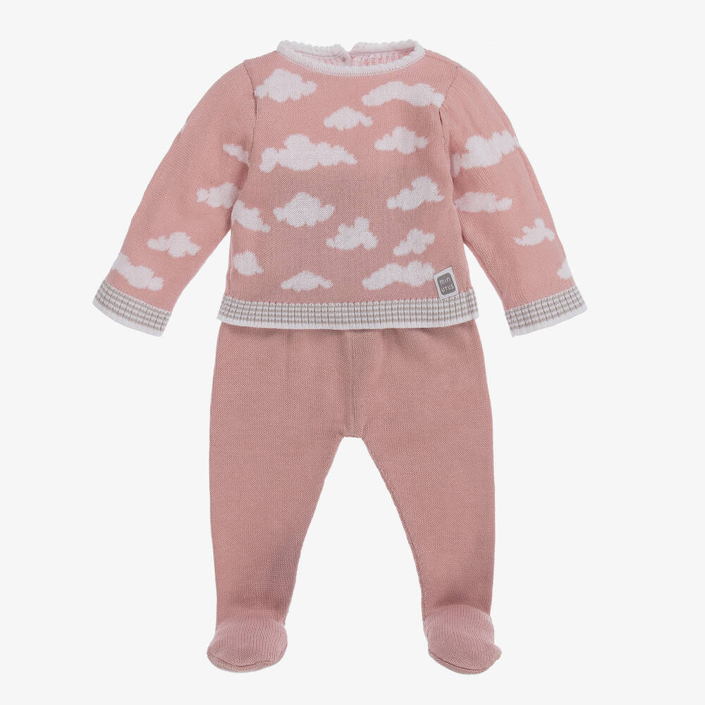 Adorable pink two piece babygrow for girls by Spanish designer Minutus, made in a soft cotton knit. The top has a white knitted cloud pattern and contrast striped ribbed trims, with button fastenings on the back. The trousers have a wide, fold-over waistband for a comfortable fit on little tummies.