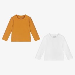 In terracotta pink and pale pink, this pack of two tops for baby girls is by Danish brand Minymo. Soft and comfortable, they are made in ribbed organic cotton jersey, with popper fastenings on one shoulder.
