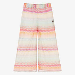 Teen girls pink striped trousers by Missoni, crafted in the signature fine viscose crochet knit. These stylish resort wear trousers feature a flared leg for a seventies-inspired look, a stretchy white elasticated waistband, and a concealed back zip. The lightweight lining ensures comfort and modesty, enhanced by a silver-tone logo charm on the front. Limited quantities available.