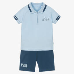 The blue cotton jersey shorts set for boys by Mitch & Son combines style and comfort. Crafted from soft, stretchy cotton, the white T-shirt features charming logo embroidery and practical popper fastenings on the shoulder. The matching sky blue shorts offer easy pull-on wear with an elasticated waistband and exposed seams. Ideal for warm weather, this outfit is perfect for everyday adventures. Limited quantities available, so don't miss out on this delightful set.