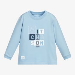 White top for boys by Mitch & Son, made in soft cotton jersey. The front has an embroidered and printed logo design in blue and white.