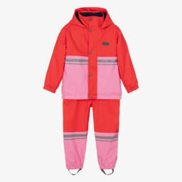 Rain wont stop play with this waterproof raincoat and salopette combination for boys and girls by Mitty James. Exclusive to Childrensalon, the set is colourblocked in shades of blue, is super soft, comfortable and easy to wear, with reflective detailing for safety. The jacket is warm and cosy, with a fleece-lined hood, stand-up collar and elasticated trims for extra cosiness. There is a flap over the front zip that fastens with branded poppers to keep the weather out and the warmth in, and a rubberised grey logo badge on the front. It has a satin lining and useful, concealed side pockets. The matching salopettes have adjustable, elasticated shoulder straps and popper fastenings on the sides for a good fit. The elasticated cuffs have detachable stirrups to keep them in place.