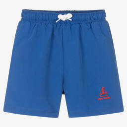Exclusive to Childrensalon, a pair of yellow UPF 50+ swim shorts for boys by Mitty James. Soft and lightweight, they have a jersey lining for comfort, with the brand's logo embroidered in navy blue on the front. There is a drawstring tie on the waistband for a good fit.