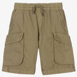 Boys black cargo shorts by Molo, made with soft cotton canvas. The waistband is elasticated and has a drawstring tie. There are popper fastening pockets on the legs and on the back. They also have slanted front pockets.