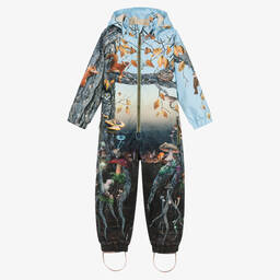 Beige snowsuit for boys by Danish brand Molo, patterned with a graphic astronaut suit print. Made in recycled material with Bionic Finish ECO coating, it is water and windproof whilst the fleecy inside and elasticated cuffs help keep warmth in. The lined hood is easily detached via poppers for an alternative finish on drier days. The detachable rubber stirrups can be adjusted with buttons to prevent the trousers from rising up and allowing snow in. Zip fastenings with light reflective logo tabs make dressing easy and secure the front pockets.