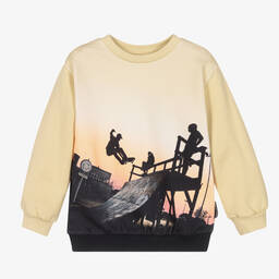 Boys pale khaki green and black crew neck sweatshirt by Molo, made in soft organic cotton jersey. It has a cool skateboarding print across the front and back, with orange sunset colours in the background, making it ideal for any action or sports lover.