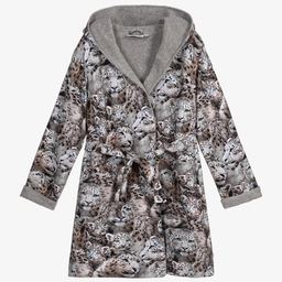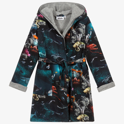 Boys brown and grey hooded bathrobe by Molo, with a forest animals print. Cosy and comfortable, it is made in organic cotton jersey and lined with soft grey towelling. There are two patch pockets on the front, and an elasticated waistband with a tie fastening.