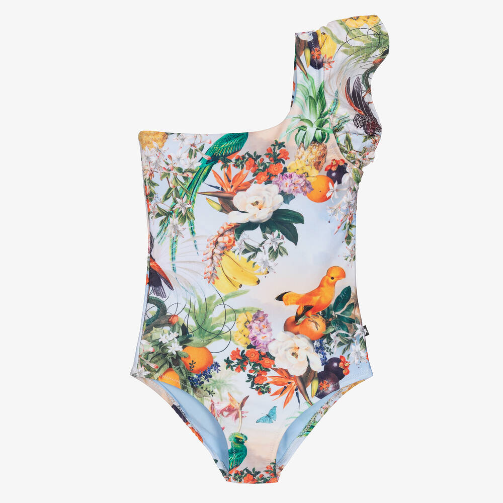 Light blue swimsuit for girls from Danish brand Molo, with UPF 50+. Silky smooth and stretchy, it is fully lined for added comfort and modesty. It is patterned with a quirky print of tropical birds and plants, and it has one frilled strap for an asymmetric silhouette.