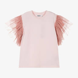 Girls pink tulle sleeve shirt by Molo is crafted from soft jersey cotton, offering both comfort and style. The short sleeves are elegantly adorned with delicate gathered tulle, creating a chic and playful look. Perfect for the spring and summer months, this top is ideal for casual outings or special occasions. Limited quantities available, so make sure to add this charming piece to your collection while stocks last.