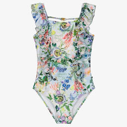 Stylish green and shimmery gold swimsuit for girls by Molo. It is made in soft and stretchy, waffle-textured nylon with full lining. The pretty ruffle trim on the shoulders and around the low scooped back gives it a flattering silhouette. There is a matt gold tone clasp fastening across the back to keep the straps in place.
