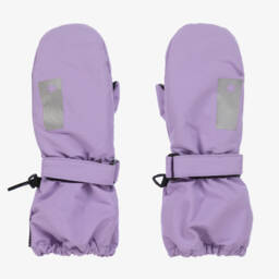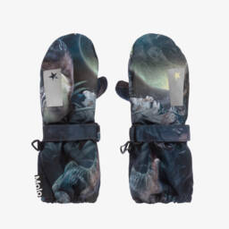 Beige ski mittens for girls by Danish brand Molo, with a rabbit and snowdrop pattern and reflective trims for improved visibility. Made using recycled materials, these waterproof, windproof and breathable mittens have lightweight, technical padding and a soft fleece lining for warmth. The long cuffs adjust with velcro, they have slip-resistant palms for good grip, and they can be clipped together to keep them safe when not in use.