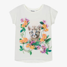 Girls ivory floral puma top by Molo features a playful puma print surrounded by vibrant florals. Crafted from soft organic cotton jersey, it offers seamless capped sleeves and a stylish high-low hem, ensuring comfort and elegance. Ideal for spring and summer, this top is perfect for pairing with jeans or skirts. Limited quantities available, so secure this charming piece for a standout wardrobe addition.