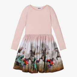 The girls organic Navy Blue sunset dress by Molo presents a vibrant sunset and horse print, suitable for autumn adventures. Crafted from soft organic cotton, the fitted bodice features a stretchy ribbed jersey with long sleeves, while the gathered waist leads to a full-circle poplin skirt. Ideal for pairing with cosy tights, this dress offers comfort and style for any occasion. Limited quantities available, so seize this last chance to buy.