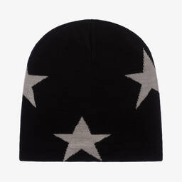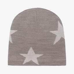 Boys and girls grey wool hat by Danish brand Molo, knitted from a super soft wool acrylic blend. Lined with warm grey fleece, it has a cute white star pattern.