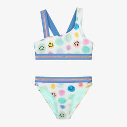 This glitter lilac bikini for teen girls by Molo features a chic textured fabric woven with glittery threads. The elasticated straps and trims have blue, purple, and metallic gold stripes, adding a stylish contrast. Crafted from recycled fibers with UPF50+ protection, it offers a soft, stretchy, and fully lined fit for comfort. Suitable for sunny days at the beach, this unique piece is available in limited quantities, so it's the last chance to buy.