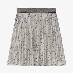 Silver glittery skirt for teen girls by Danish brand Molo, patterned with contrasting grey stars. Made in stretchy, pleated polyester jersey, it has an elasticated lurex waistband for fit and comfort.