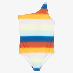 Green asymmetric swimsuit for teen girls by Danish brand Molo, made from Repreve® recycled polyester sourced from plastic bottles. Soft and stretchy, it has a cool all-over zebra and tiger print, with a sequin embellished butterfly on the strap.
