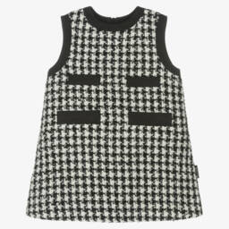 Grey marl hooded dress for little girls by luxury brand Moncler Enfant, with a stylish dropped waist. Made in soft sweatshirt jersey, this easy-to-wear piece has the brand's cursive logo printed on the chest in shimmery silver, and the iconic felt logo badge on one sleeve for instant brand recognition. It has logo embossed popper fastenings on the front for easy dressing.