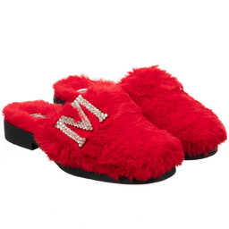 Girls black faux fur slip-on shoes from Monnalisa, with a silver diamanté 'M' on the front. They are lined in soft leather, with faux fur inner soles and non-slip rubber outer soles.