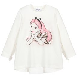 This charming ivory peplum top for girls by Monnalisa, crafted in soft cotton jersey, features Disney's Lady and the Tramp with Lady and 'Hugs and Kisses' in sparkling diamantés on the front. The tunic-style design includes gently puffed long sleeves, a frilled hem, and a keyhole button fastening at the back. Suitable for autumn and winter wear, this delightful piece is available in limited quantities, making it a last chance to buy.