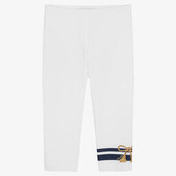 Girls navy blue leggings by luxury brand, Monnalisa. This nautical-inspired design features white stripes and a gold rope motif on one ankle, with the designer's logo on the side. Soft and stretchy, they are full-length and have an elasticated waistband for comfort.