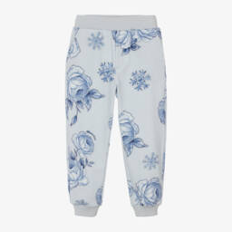 Pretty pink joggers for younger girls by Italian designer Monnalisa. Made in comfortable cotton jersey, they have embroidered pink roses and blue butterflies on one leg. There are pale blue and ivory stripes on the sides, jetted pockets and ribbed trims.