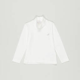 Lovely pink cotton top for girls by Italian brand Monnalisa. Made in a soft and stretchy jersey, this long-sleeved, roll neck style is ideal to wear alone or as a layering piece. For an extra girly touch, there is a sparkling diamanté logo on the chest.