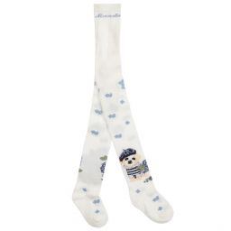 Ivory and pink tights for little girls by Monnalisa, made in a soft and stretchy cotton blend. They have a cute dog wearing a beret and a Breton style T-shirt, with a pretty pink scattered flower pattern. There is a blue logo around the waist.