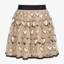 Navy blue tulle skirt for teen girls by Monnalisa, with beautifully embroidered wool-blend hearts in ivory, navy blue, brown and gold. There is a navy blue grosgrain trim on the hem and a branded elasticated waist for easy pull-on. Layers of soft tulle create volume and it has a lightweight viscose blend lining.