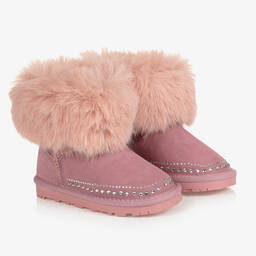 Statement light brown suede leather boots for teen girls by Monnalisa. The sparkling silver rhinestones complement the tan brown oversized faux fur trims for a glamorous look. Embossed snowflakes on the chunky soles give a wintery feel to these cosy boots.