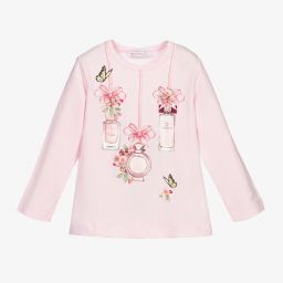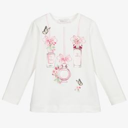 Ivory top for teen girls by Monnalisa, easy to pair with jeans or a skirt for smarter occasions. Made in comfortable cotton jersey, it has an elegant flower and perfume bottle design in pale pink and green, incorporating the brand's logo.