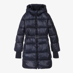 Ivory puffer coat for teen girls by Italian brand Monnalisa, beautifully cinched in at the waist by a detachable elasticated belt with a silver logo clasp. Warmly padded, it has a ribbed collar and matching cuff inserts with thumb holes for extra cosiness. The hood has bow detailing on top and fastens with poppers, to keep out winter chills. There is a zip fastening on the front, concealed, zipped pockets, and a silver crest logo badge on one sleeve.