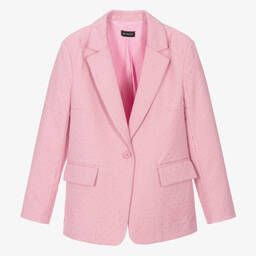 Monnalisa Chic girls stunning white lace blazer beautifully tailored with large feature diamanté popper fastening at the waist. The two front pockets and cuffs are trimmed in elasticated ribbed fabric and woven with sparkly gold thread. The main body of the jacket is lined in a chiffon polyester fabric for comfort and the sleeves are unlined adding to the sophisticated look.