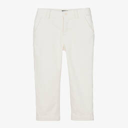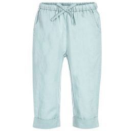 Baby girls ivory slim-fit style trousers, with a yellow-gold leaf pattern by Moon et Miel. Made from cotton cheesecloth, which has a crinkle textured feel. There is a little bow on the elasticated waistband, they have side pockets and turn-ups on the hems.