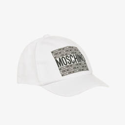 The black block logo cap for junior boys and girls by Moschino showcases a striking white logo pattern on the front. Crafted from soft cotton twill and featuring a comfortable mesh lining, the cap is designed for both style and practicality. An adjustable Velcro strap ensures a secure fit, making it perfect for everyday wear. With limited quantities available, this cap is a must-have accessory for the fashion-forward youngster.