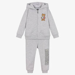 Casual cobalt blue tracksuit for little boys, by Moschino Baby. Made in soft cotton sweatshirt jersey, the zip-up hoodie has a Moschino Teddy Bear print on the chest, holding a fun football. The back is printed with a spell-out grid logo, designed to look like a football net, and has a logo-embossed front zip fastening for a discreet designer detail. It pairs with matching joggers to complete the sporty look.