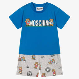 A red and grey shorts set for little boys, by luxury fashion house Moschino Baby. Easy-to-wear, the cotton jersey T-shirt has shoulder popper fastenings, while the shorts have a stretchy waistband and comfy pockets. For an instantly recognisable look, both items feature the brand's iconic Teddy Bear logo, having fun playing football.