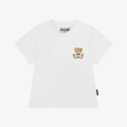 Light blue bear logo T-shirt by Moschino for junior boys features a delightful teddy bear motif on soft cotton jersey. The charming design offers comfort with popper fastenings on the shoulder for easy dressing. Perfect for casual outings, this T-shirt combines style with practicality, making it an ideal choice for the warmer seasons. Limited quantities are available, ensuring a unique addition to any wardrobe.